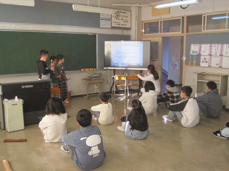 給食センターの栄養教諭に来校いただき、栄養指導を行いました。給食を食べながらではありましたが、よく噛んで食べることの大切さを学び、食への関心を高めていました。