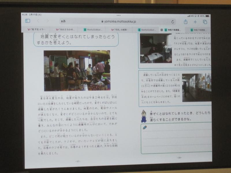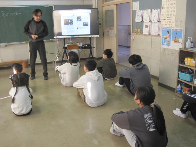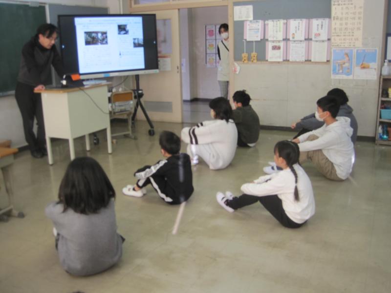 スポーツタイムで、「牡鹿音頭」に挑戦してみました。動画をお手本に、見よう見まねでまずは体験。その後、ストレッチで寒さで縮こまった体を伸ばしました。