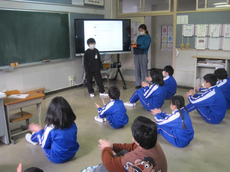 全校朝の会で、上手にできるようなった縄跳びの様子を発表しました。レベルアップしていく様子を動画で紹介し、友達からたくさん拍手をもらいました。