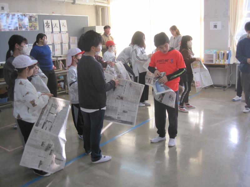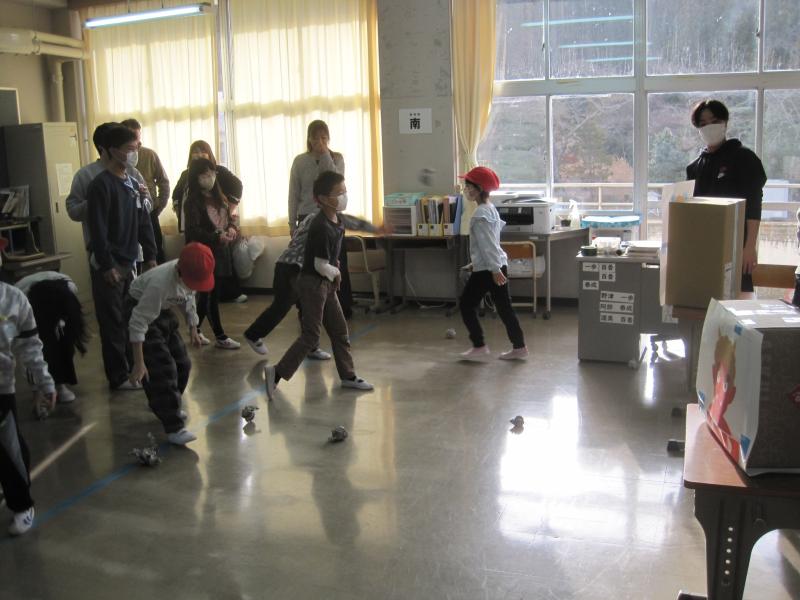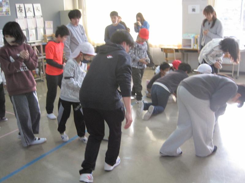 スポーツタイムで、「牡鹿音頭」に挑戦してみました。動画をお手本に、見よう見まねでまずは体験。その後、ストレッチで寒さで縮こまった体を伸ばしました。