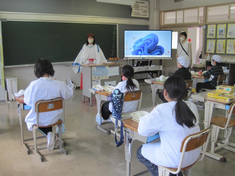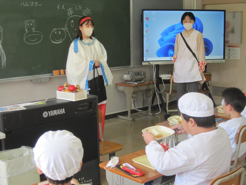 給食センターの栄養教諭に来校いただき、栄養指導を行いました。給食を食べながらではありましたが、よく噛んで食べることの大切さを学び、食への関心を高めていました。